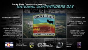 Rocky Flats Right to Know community meeting on National Downwinders Day, January 27th, 2025 in Arvada. The meeting will include local advocates, experts, and members from the film Half-Life of Memory. The gathering is a chance to come together and discuss Rocky Flats ongoing concerns and actions needed for moving advocacy forward. We would love for you to join us!